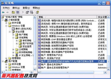 - 然后在左窗格中依次展开“计算机配置/Windows 设置/安全设置/本地策略”目录,并单击选中“安全选项”。在右窗格列表中找到“账户:使用空白密码的本地账户只允许进行控制台登录”选项,默认处于“已启用”状态。因为Windows XP的安全策略中采用了“拒绝优先”的原则,所以空口令的用户通过网络访问使用Windows XP的计算机时便会被禁止,如图2008120518所示。