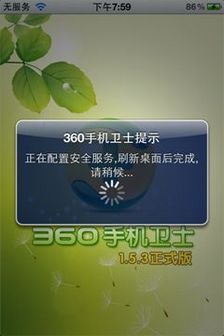 弹出提示"正在配置安全服务…",配置后会自动刷新桌面, 使360手机卫士安全服务生效。