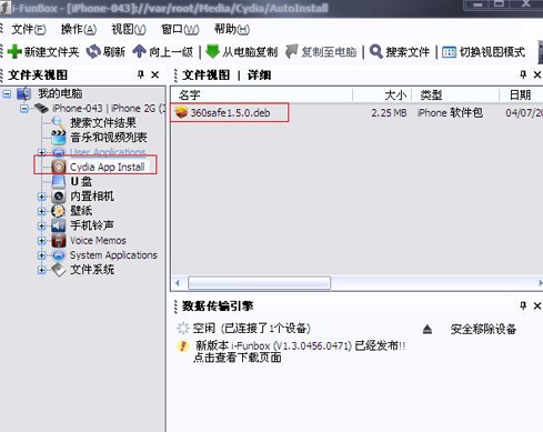 将安装包复制到ifunbox里的Cydia App Install文件夹里,然后重新启动手机,即可自动完成安装。
