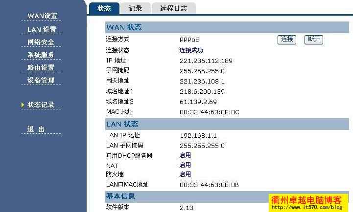 8、设置好后可以在左侧的“状态记录”里查看网络是否连接成功。WAN口反应的是当前拨号所获取到的IP地址,如果显示0.0.0.0表示拨号未成功。