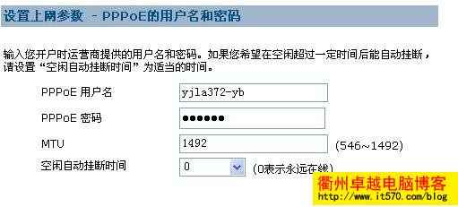 5、输入宽带用户名和密码;mtu不动;自动空闲挂断时间设为0,既永远在线.点击“下一步”: