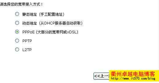 4、选择宽带接入方式:pppoe,继续点“下一步”: