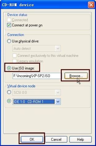 在虚拟机信息窗口中,双击光驱信息行,在打开的“CD-ROMdevice”对话框中,选择“UseISOimage”项,单击“Browser”按钮定位到下载好的ISO文件,单击“OK”按钮即可(见图3)。
