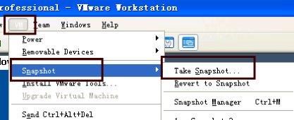 在虚拟机系统正常运行状态,依次点击“VM→Snapshot→takesnapshot”(见图4),在打开的“TakeSnapshot”对话框中为建立的Snapshot设置一个名称及相关描述信息,单击“OK”按钮,软件即为当前的系统状态创建一个Snapshot。