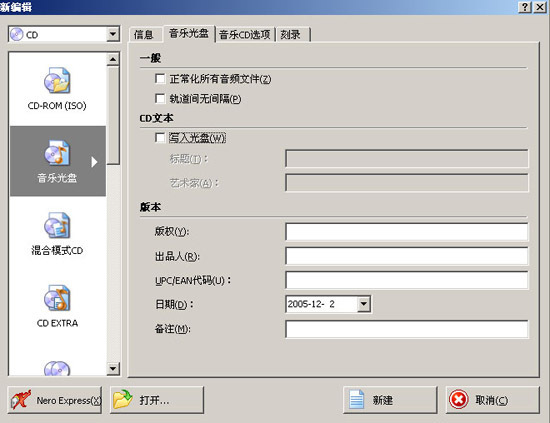 弹出新编辑对话框,在对话框左上方可以选择你的光盘类型(CD或是DVD),如图