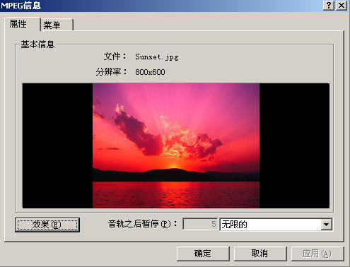 音轨之后暂停里可以设置图片需播放多少时间,点击“效果”还可以对图片添加特殊效果,如图