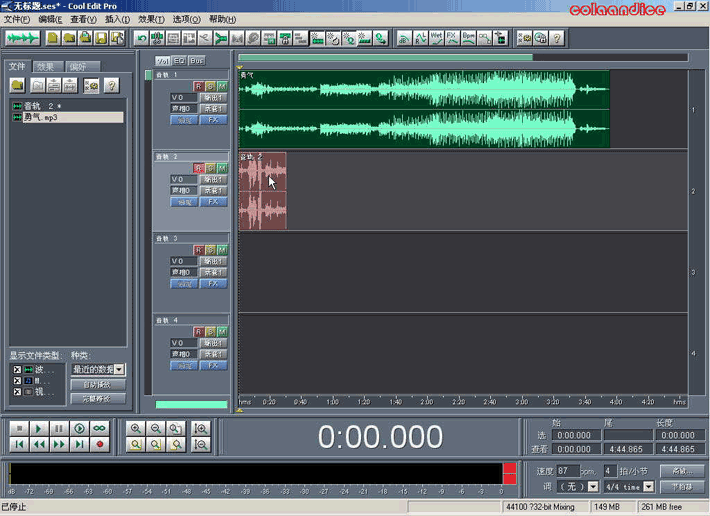 1.打开CE进入多音轨界面右击音轨1空白处,插入你所要录制歌曲的mp3伴奏文件,wav也可(图1)。
