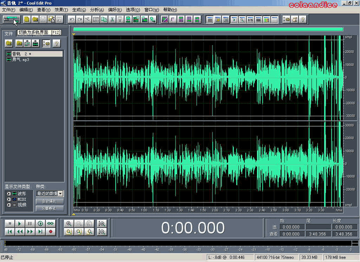 [注]需要先说明一下的是:录制时要关闭音箱,通过耳机来听伴奏,跟着伴奏进行演唱和录音,录制前,一定要调节好你的总音量及麦克音量,这点至关重要!麦克的音量最好不要超过总音量大小,略小一些为佳,因为如果麦克音量过大,会导致录出的波形成了方波,这种波形的声音是失真的,这样的波形也是无用的,无论你水平多么高超,也不可能处理出令人满意的结果的。