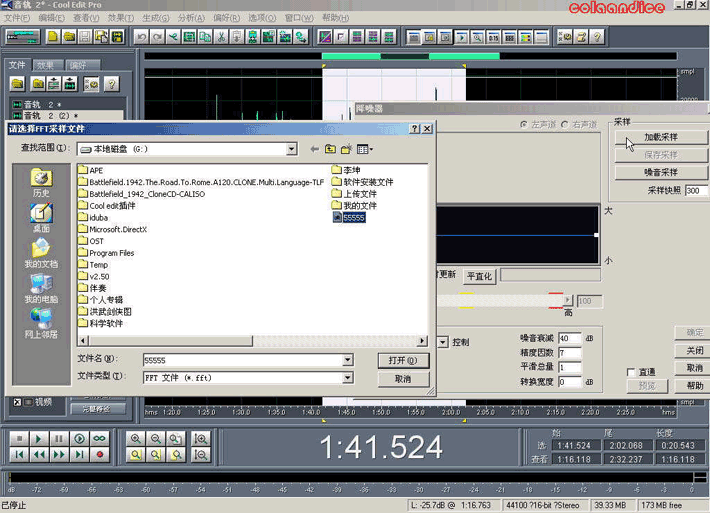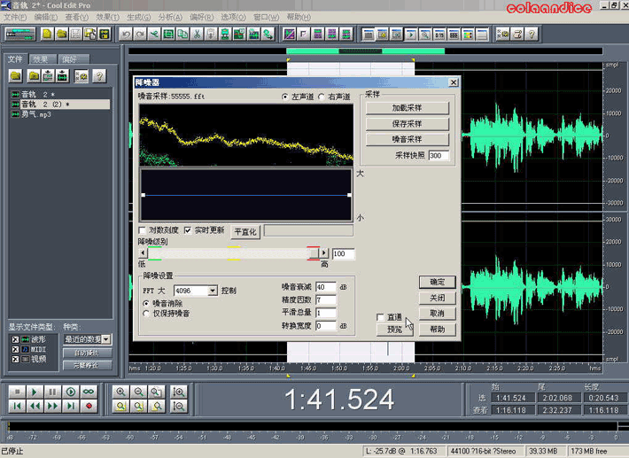 8.回到处于波形編辑界面的人声文件,打开降噪器,加载之前保存的噪声采样进行降噪处理,点确定降噪前,可先点预览试听一下降噪后的效果(如失真太大,说明降噪采样不合适,需重新采样或调整参数,有一点要说明,无论何种方式的降噪都会对原声有一定的损害) (图13 图14 图15)
