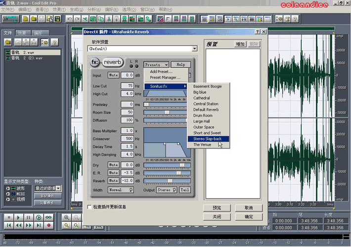 2.加载预置下拉菜单中的各种效果后(也可手动调节)点右下方的"预览"进行反复的试听,直至调至满意的混响效果后,点确定对原声进行混响处理,常用的效果如图中所示(图22 图23)。