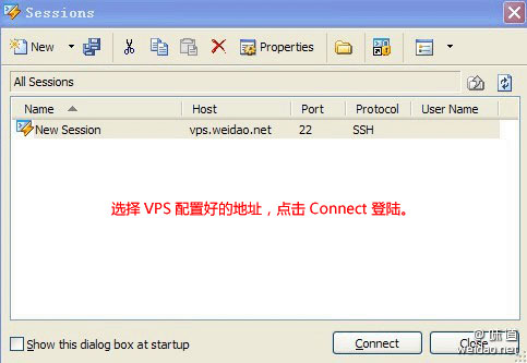 4,选择配置好的VPS地址,点 "Connect"登录;