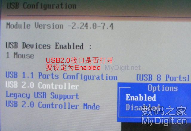 以下各项均在Advanced、Integrated Devices、USB Configuration菜单下
