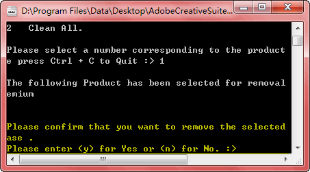 这里要选择你需要的卸载模式,如果卸载Adobe CS3/CS4的软件,则输入数字1,然后回车;要卸载Adobe CS5/CS5.5,则输入数字2并回车,要卸载Adobe Flash Player,则输入数字3并回车。