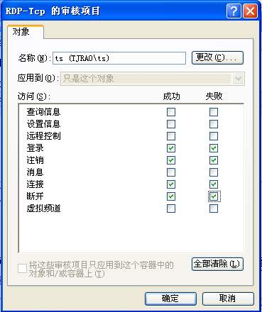 在终端服务器上的“权限”框中点击“高级”按钮,进入“审核”框,再点击“添加”,在“选择用户和组”列表框中选择“ts”,并点击“确定”,弹出“RDP-Tcp的审核项目”对话框(图6),在框中勾选想审核的项目后,点击“确定”即可。