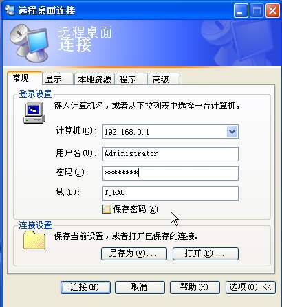 完成了客户端软件的安装后,运行“远程桌面连接”程序(图4),在“计算机”栏中填写终端服务器的IP地址,如“192.168.0.1”,在“用户名”和“密码”栏中填写用户名和密码(注意:这里填写的是在Windows Server 2003服务器上局域网管理员为你设置的账号,并不是本地客户机的用户名和密码),然后点击“连接”按钮,就可以远程登录终端服务器了。