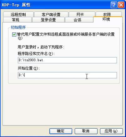 把“ts2003.BAT”设置成用户的登录脚本。在终端服务器上,进入“RDP-Tcp属性”窗口,并切换到“环境”框(图7),勾选“替代用户配置文件和远程桌面连接或终端服务客户端的设置”,在“程序路径和文件名”栏中输入“D:\ts2003.bat”,在“开始位置”栏中输入“D:\”,点击“确定”即可完成设置。此时,我们就可通过终端服务日志了解到每个用户的行踪了。