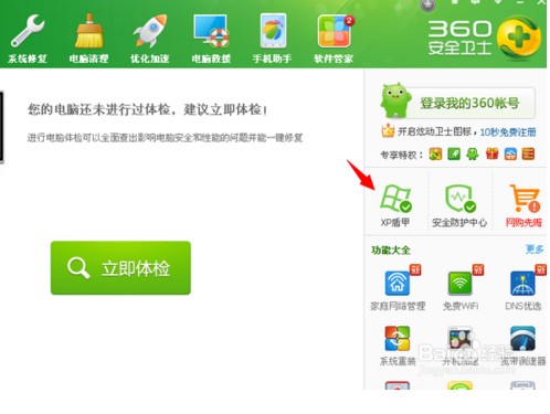 安装完成后,您会发现主界面会与普通版的360安全卫士有所不同,新增的360XP盾甲专门针对Windows XP用户提供,为XP系统保驾护航。点击右边功能大全上侧的"XP盾甲",如图所示。