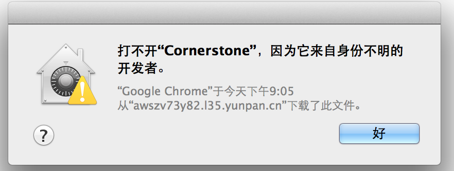 在MAC下安装一些软件时提示"来自身份不明开发者",其实这是MAC新系统启用了新的安全机制。默认只信任 Mac App Store 下载的软件和拥有开发者 ID 签名的应用程序。换句话说就是 Mountain Lion 系统默认只能安装靠谱渠道(有苹果审核的 Mac App Store)下载的软件或被认可的人开发的软件。这当然是为了用户不会稀里糊涂安装流氓软件中招,但没有开发者签名的 “老实软件” 也受影响了,安装就会弹出下图所示警告框:“打不开 xxx,因为它来自身份不明的开发者”。如下图所示