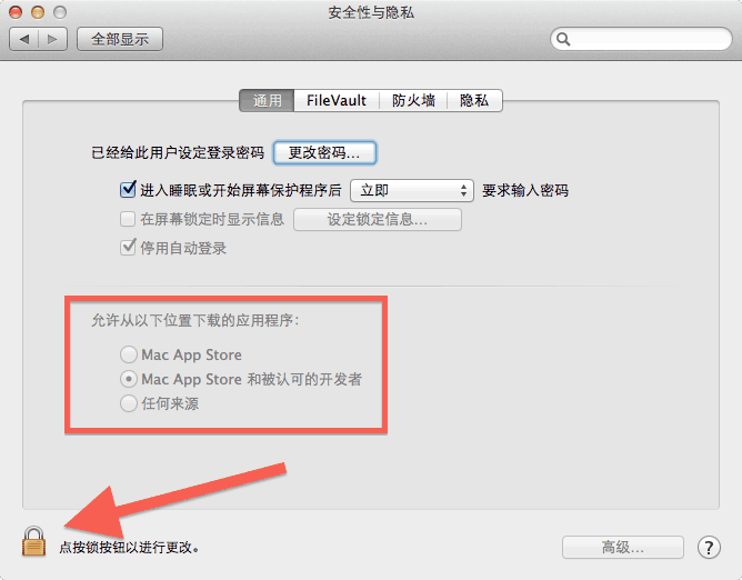 在安全与隐私设置面板里选择 “通用” 标签(其实默认就应该到那)。看到上面截图里我拿红框标出的几个选项了吧,把允下载的应用程序从默认的 “Mac App Store 和被认可的开发者” 改选为 “任何来源” 就行了。