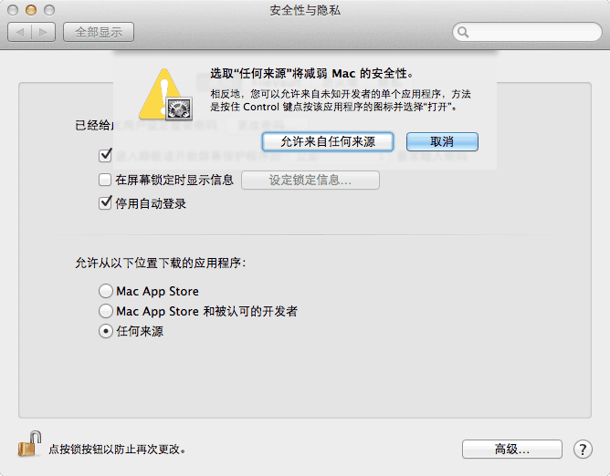现在可以更改设置了,那个被 Mountain Lion 系统警告不能安装的软件也能正常安装了。