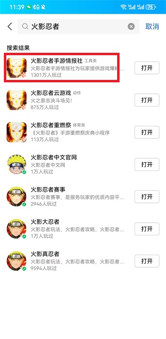 1、在QQ小程序界面搜索【火影忍者手游情报社】找到该小程序打开进入其中,如果你的游戏是以QQ登录的,才能使用;
