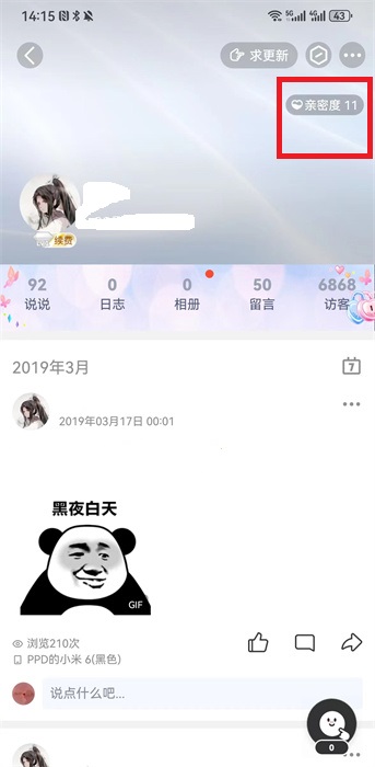 4、最后在空间动态界面的右上角就可以看到【亲密度】。