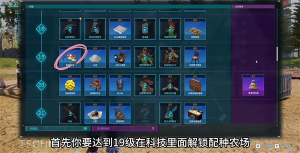 1、首先角色需要达到19级,然后才能解锁在科技中解锁配种农场,然后把其建造在自己的家园之中;