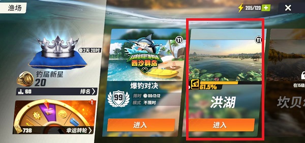 2、还需要有洪湖的地图解锁,这个要求比较低,基本上一开始就是在这里垂钓的,但是花费不同的体力的湖中心,需要一定的等级才能解锁。