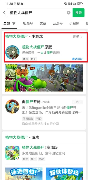 1、在微信中我们搜索【植物大战僵尸】小游戏,然后进入到游戏小程序之中,不需要解锁就可以体验;