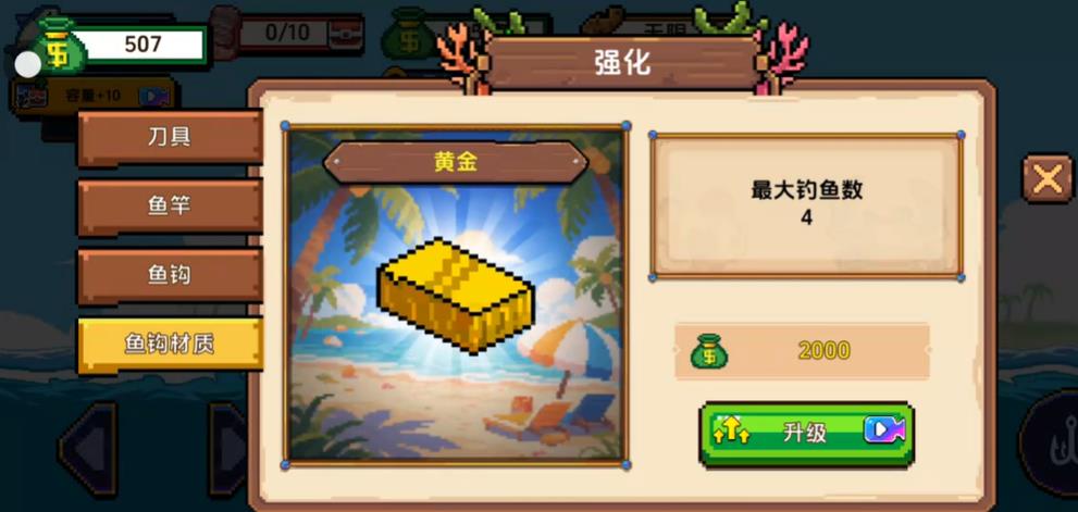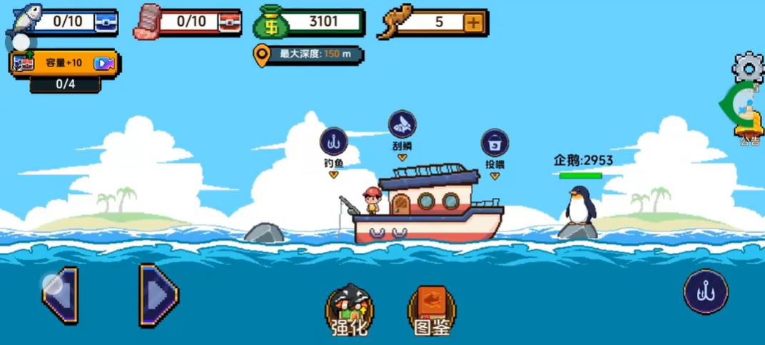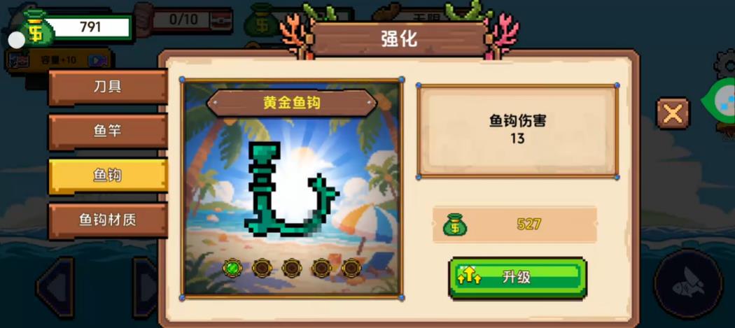 2、升级鱼竿可扩大钓鱼范围升级鱼钩能提升对大鱼的伤害通过强化钓具逐步挑战更难钓的鱼种提高渔获品质与价值。