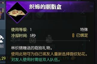 5、完成怨绮罗奇遇可获得织锦的胭脂盒,该物品能改变自己或他人的面纹贴花,是颇具特色的奇遇奖励。