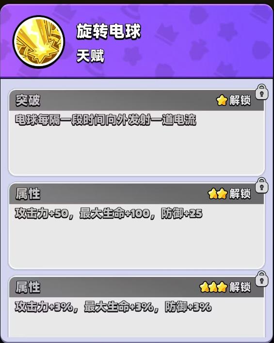 1、大祭司核心技能旋转电球释放后电球围绕自身旋转攻击敌人,升星后可依次解锁发射电流造成眩晕提升伤害产生吸附效果以及生成新电球等天赋,输出能力随星级提升显著增强。