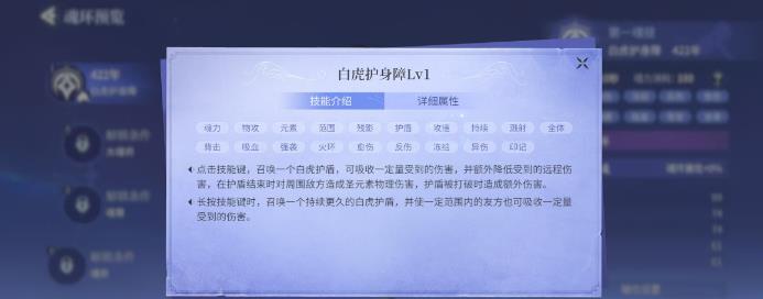 1、第一魂环白虎护身障:单击能为自身套护盾,护盾结束或破时对周围敌人造成圣元素物理伤害,长按可持久施展还能给周围友方附加护盾,是团战保护后排的神技。