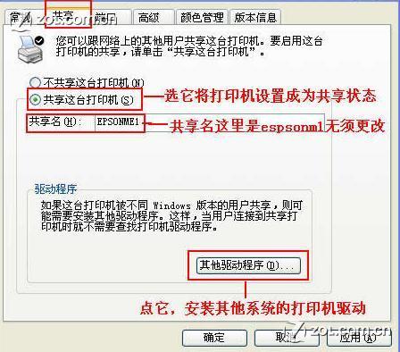 设置好后,这里我们默认的打印机是EPSON ME 1,所以打开EPSON ME 1属性,然后点共向后,选择共享打印机,共享名,默然的是EPSON ME 1,这里我们不需要改,请看图片
