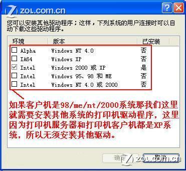 因为这里两台电脑,都是winxp系统,所以我们不需要装其他的驱动,默认的打印机服务器就是WINXP系统,而客户机也是XP系统,所以这里无需安装了.如果是打印机客户机是win98系统那就需要选择windows 98.98.ME这个安装驱动.好了.然后按确定,打印机服务器就算设置完成了