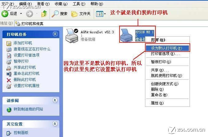 做好了前两步,现在做最后一步,也是最重要的一步,打开 我的电脑,控制面板,在打开打印机和传真,这里我们必须设置为默认的打印机,如果不是默认打印机,请鼠标右键 设置为默认的打印机.请看图片