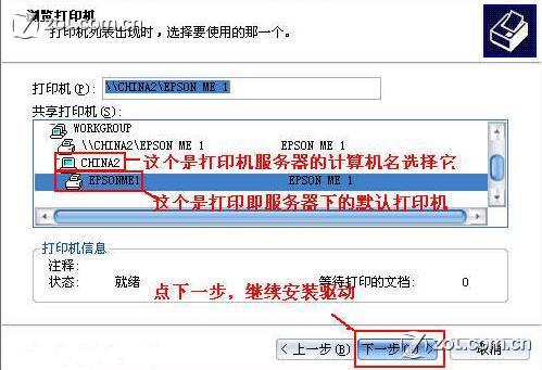 我们打开china2,就会看到打印机服务器里的默然的打印机,EPSONME1,(EPSONME1是我的默认打印机,大家可以根据自己的默认打印机去选择.)然后鼠标双击会提示你安装网络打印几驱动,按确定即可搜索和安装网络打印机驱动了,请看下面的图片