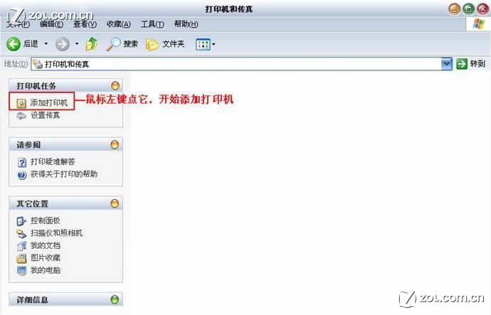 我们依次打开我的电脑--控制面板--打印机和传真,然后点添加打印机,