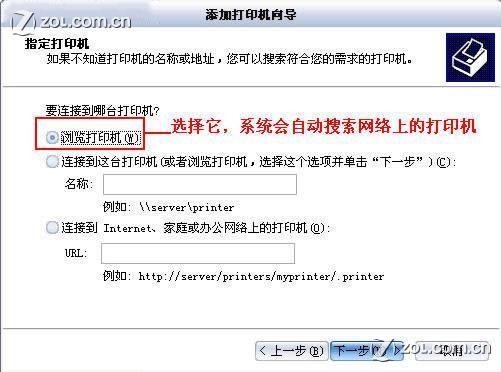 然后点下一步,这里我们要浏览到打印机服务器下的默认打印机,